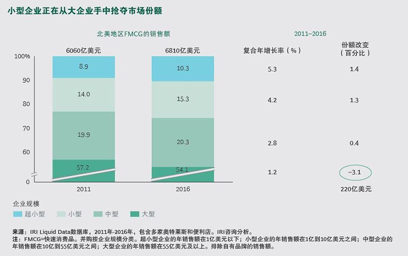 過去50年,跨國消費(fèi)品企業(yè)強(qiáng)化品牌、擴(kuò)展產(chǎn)品組合、穩(wěn)步提高市場占有率和收入,創(chuàng)造了強(qiáng)大的股東價(jià)值。那曾是大媒體、大零售商、大品牌的時(shí)代。大約五年前,規(guī)模較小的企業(yè)和品牌首次開始瓜分大品牌的蛋糕。在2011年到2016年間,北美地區(qū)大約220億美元的行業(yè)銷售從大企業(yè)轉(zhuǎn)移到小企業(yè)。歐洲也經(jīng)歷了同樣的改變。
