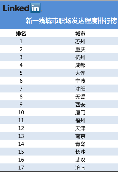 新一線城市職場最發(fā)達城市:蘇州、重慶、杭州、成都